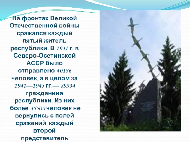 1941 г. в Северо-Осетинской АССР было отправлено 40186 человек, а в целом за 1941—1945 гг.— 89934 гражданина республики. Из них более 45500 человек не вернулись с полей сражений, каждый второй представитель Северной Осетии, участвовавший в войне, погиб на фронте.