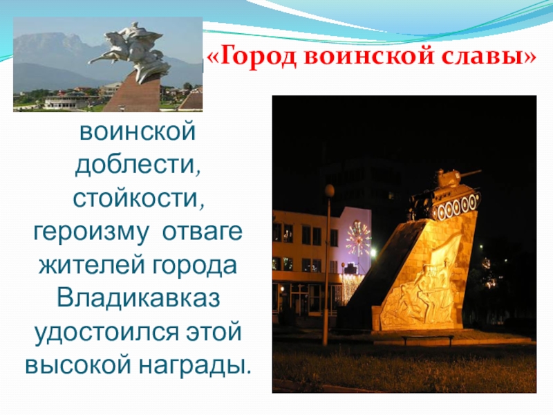 Слайд 21Благодаря мужеству, воинской доблести, стойкости, героизму отваге жителей города Владикавказ удостоился