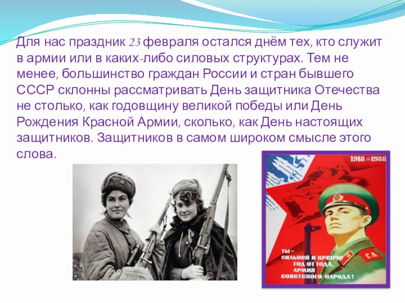армии или в каких-либо силовых структурах. Тем не менее, большинство граждан России и стран бывшего СССР склонны рассматривать День защитника Отечества не столько, как годовщину великой победы или День Рождения Красной Армии, сколько, как День настоящих защитников. Защитников в самом широком смысле этого слова.