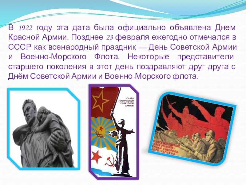 Слайд 36После распада Советского Союза дата была переименована в День защитника Отечества.