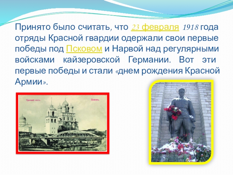 одержали свои первые победы под Псковом и Нарвой над регулярными войсками кайзеровской Германии. Вот эти первые победы и стали «днем рождения Красной Армии».