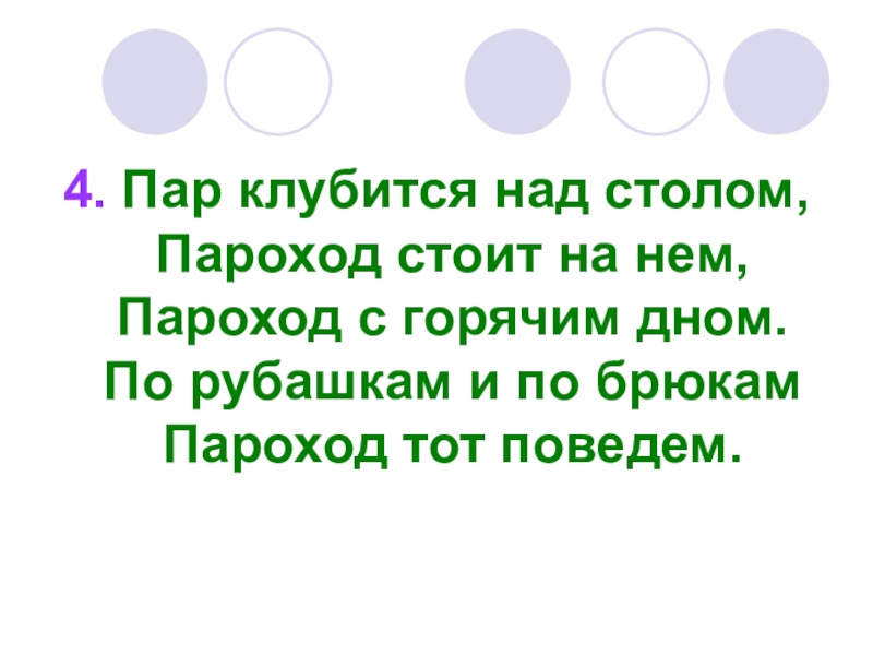 4. Пар клубится над столом, Пароход стоит на нем, Пароход с горячим дном. По