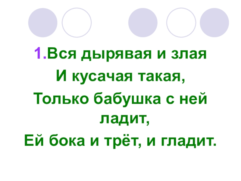 1.Вся дырявая и злаяИ кусачая такая,Только бабушка с ней ладит,Ей бока и трёт, и гладит.