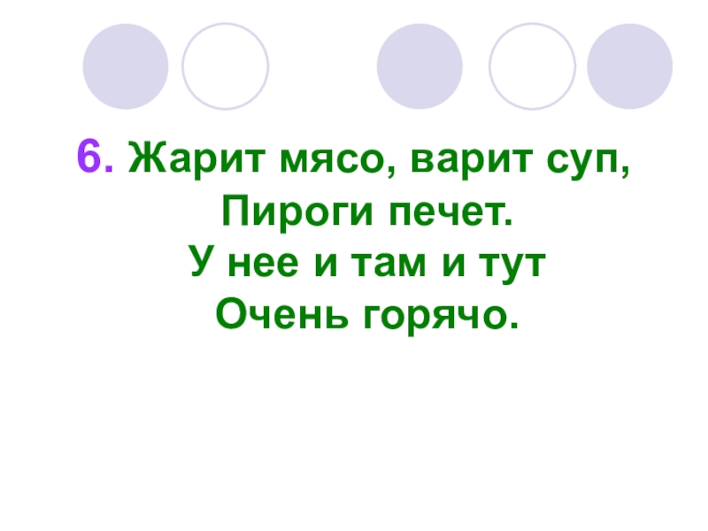 6. Жарит мясо, варит суп, Пироги печет. У нее и там и тут Очень горячо.