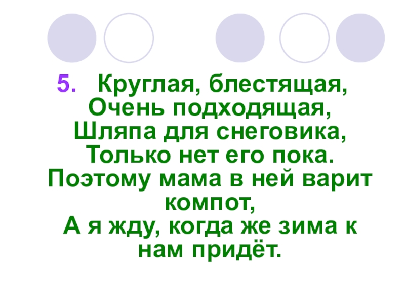 5.   Круглая, блестящая, Очень подходящая, Шляпа для снеговика, Только нет его пока. Поэтому мама в