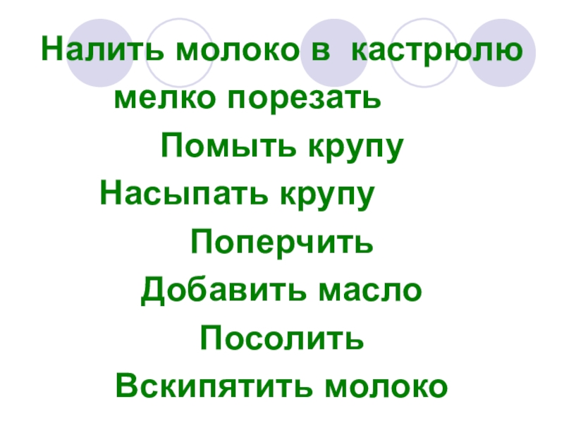 1.Налить молоко в кастрюлю 2. Вскипятить молоко      3.Помыть крупу