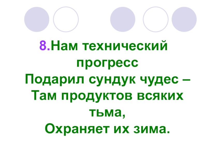 8.Нам технический прогресс Подарил сундук чудес – Там продуктов всяких тьма, Охраняет их зима.