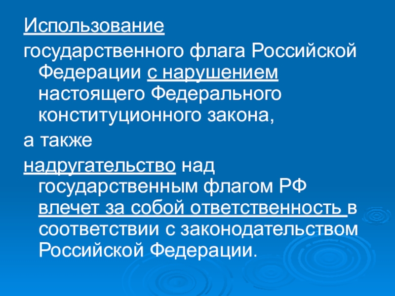 надругательство над государственным флагом РФ влечет за собой ответственность в соответствии с законодательством Российской Федерации.