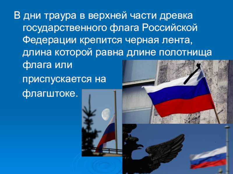 Слайд 14В дни траура в верхней части древка государственного флага Российской Федерации