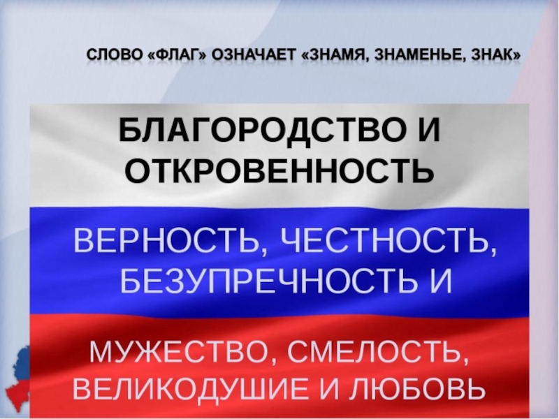 Российской Федерации представляет собой прямоугольное полотнище из трех равновеликих горизонтальных полос: верхней - белого, средней - синего и нижней - красного цвета.