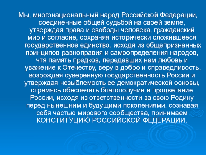 утверждая права и свободы человека, гражданский мир и согласие, сохраняя исторически сложившееся государственное единство, исходя из общепризнанных принципов равноправия и самоопределения народов, чтя память предков, передавших нам любовь и уважение к Отечеству, веру в добро и справедливость, возрождая суверенную государственность России и утверждая незыблемость ее демократической основы, стремясь обеспечить благополучие и процветание России, исходя из ответственности за свою Родину перед нынешним и будущими поколениями, сознавая себя частью мирового сообщества, принимаем КОНСТИТУЦИЮ РОССИЙСКОЙ ФЕДЕРАЦИИ.
