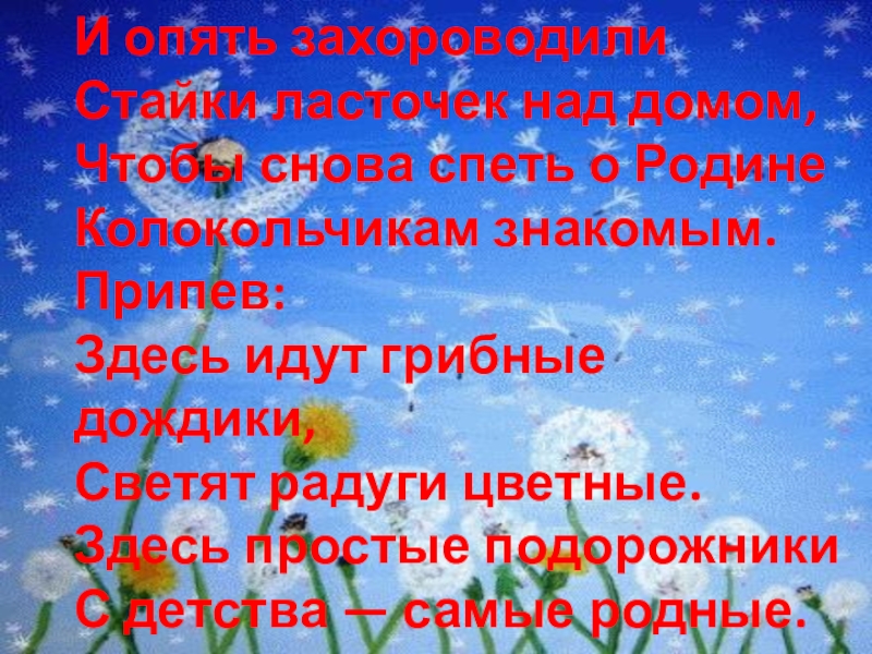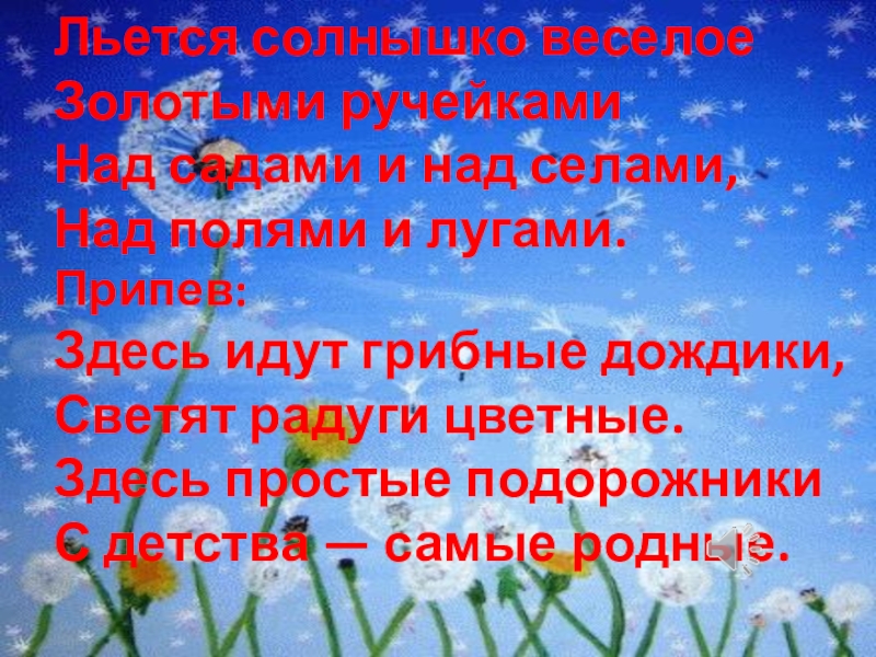 Льется солнышко веселое Золотыми ручейками Над садами и над селами, Над полями и лугами.Припев: Здесь идут грибные дождики, Светят радуги цветные. Здесь простые подорожники С детства — самые родные.