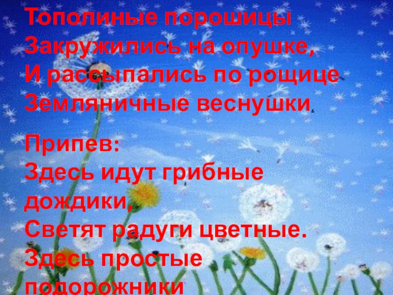 Тополиные порошицы Закружились на опушке, И рассыпались по рощице Земляничные веснушки. Припев: Здесь идут грибные дождики, Светят