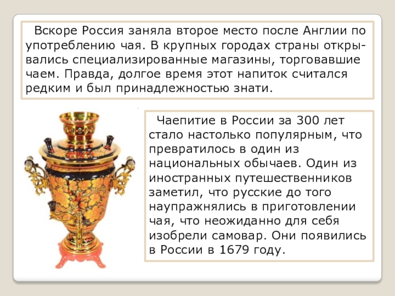 Чаепитие в России за 300 лет стало настолько популярным, что превратилось в один из национальных обычаев. Один из иностранных путешественников заметил, что русские до того наупражнялись в приготовлении чая, что неожиданно для себя изобрели самовар. Они появились в России в 1679 году.