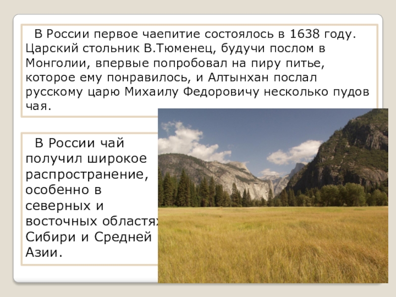 В России чай получил широкое распространение, особенно в северных и восточных областях Сибири и Средней Азии.