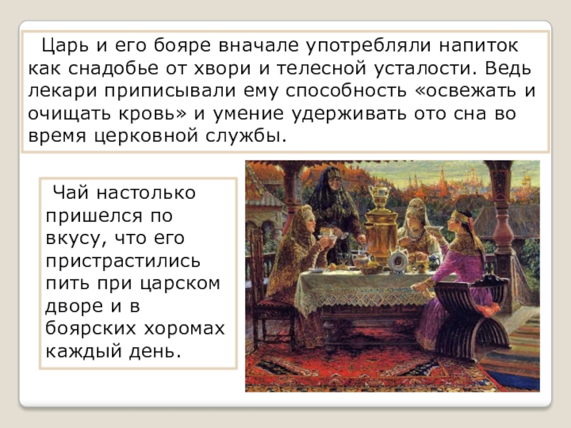 Чай настолько пришелся по вкусу, что его пристрастились пить при царском дворе и в боярских хоромах каждый день.