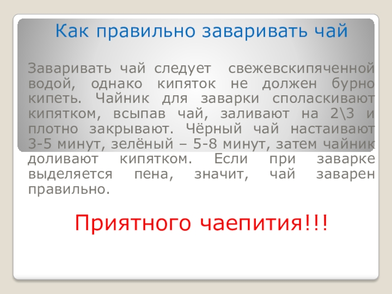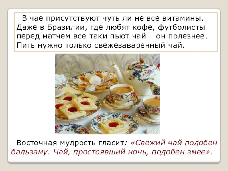 Восточная мудрость гласит: «Свежий чай подобен бальзаму. Чай, простоявший ночь, подобен змее».