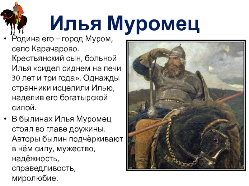 Илья «сидел сиднем на печи 30 лет и три года». Однажды странники исцелили Илью, наделив его богатырской силой.