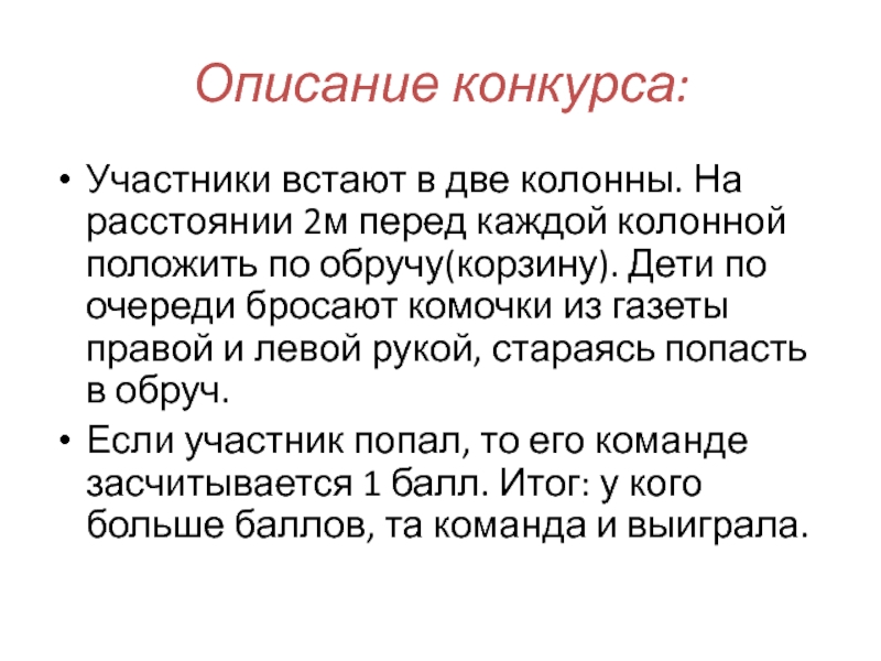 колонной положить по обручу(корзину). Дети по очереди бросают комочки из газеты правой и левой рукой, стараясь попасть в обруч.