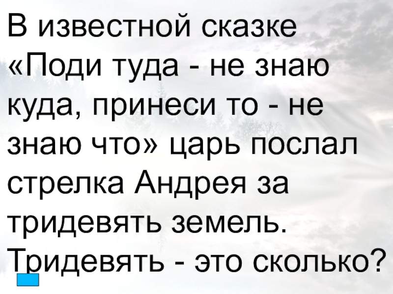 - не знаю что» царь послал стрелка Андрея за тридевять земель. Тридевять - это сколько?