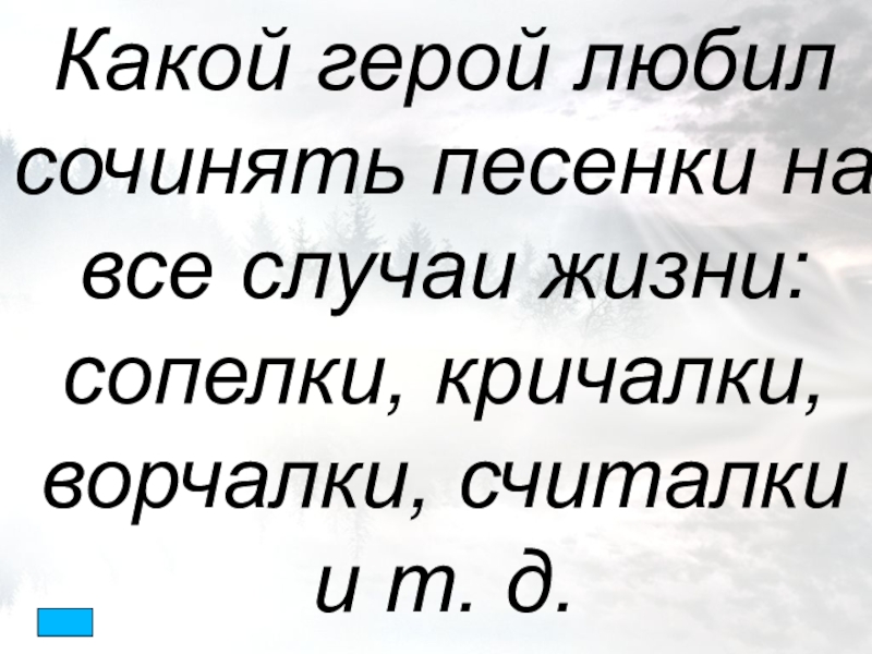 Слайд 23Какой герой любил сочинять песенки на все случаи жизни: сопелки, кричалки,