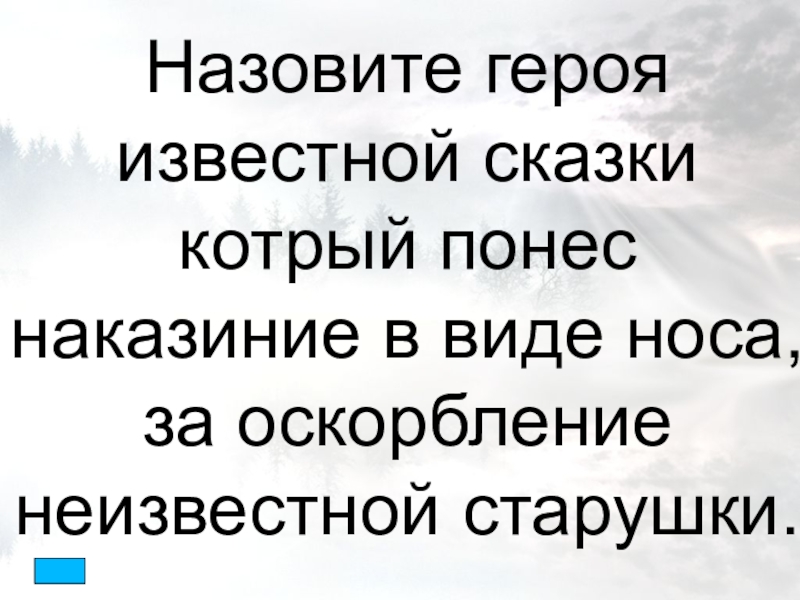 Слайд 13Назовите героя известной сказки котрый понес наказиние в виде носа, за