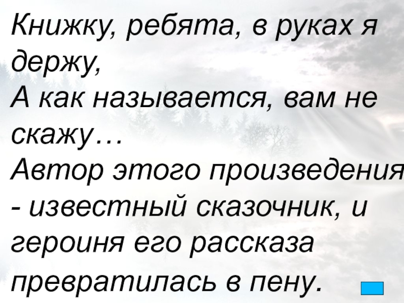 Книжку, ребята, в руках я держу,А как называется, вам не скажу…Автор этого произведения - известный сказочник, и