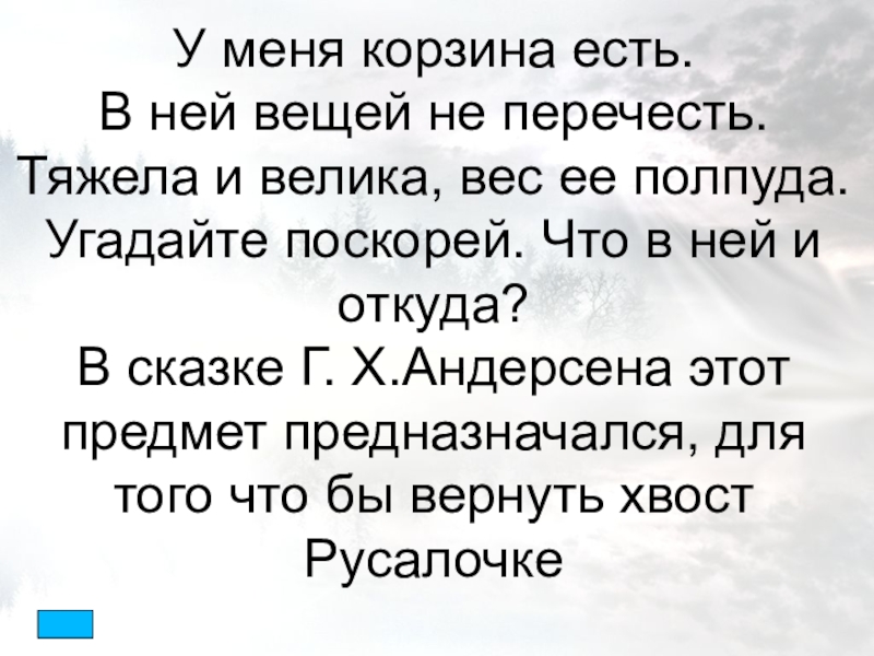 У меня корзина есть.В ней вещей не перечесть.Тяжела и велика, вес ее полпуда.Угадайте поскорей. Что в ней