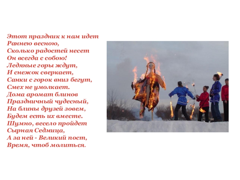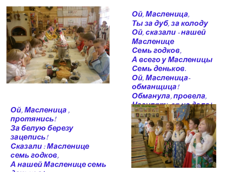 Широкорожая Масленица, Мы тобою хвалимся, На горах катаемся, Блинами объедаемся!