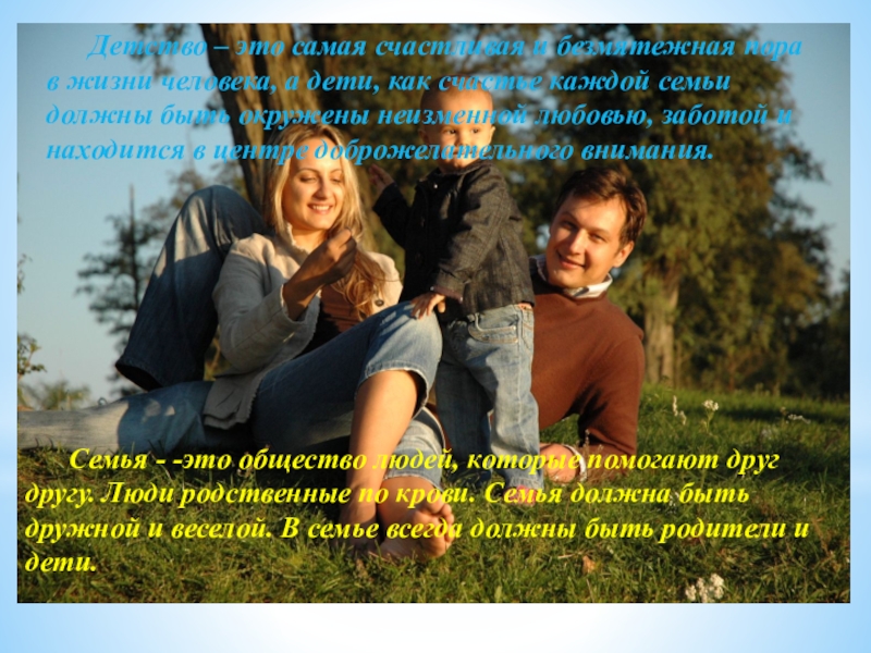 Семья - -это общество людей, которые помогают друг другу. Люди родственные по крови. Семья должна быть дружной и веселой. В семье всегда должны быть родители и дети.