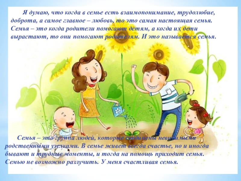 Семья – это группа людей, которые соединены невидимыми родственными узелками. В семье живет всегда счастье, но и иногда бывают и трудные моменты, и тогда на помощь приходит семья. Семью не возможно разлучить. У меня счастливая семья.