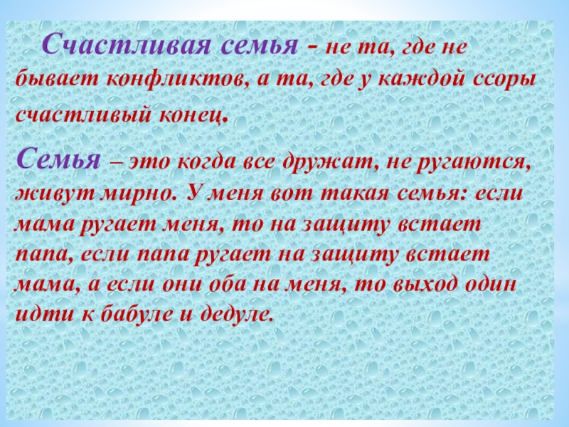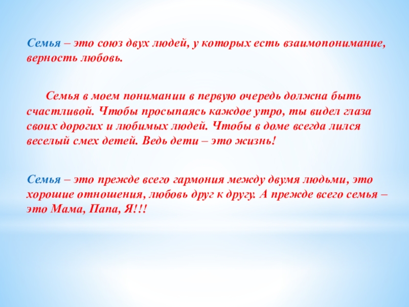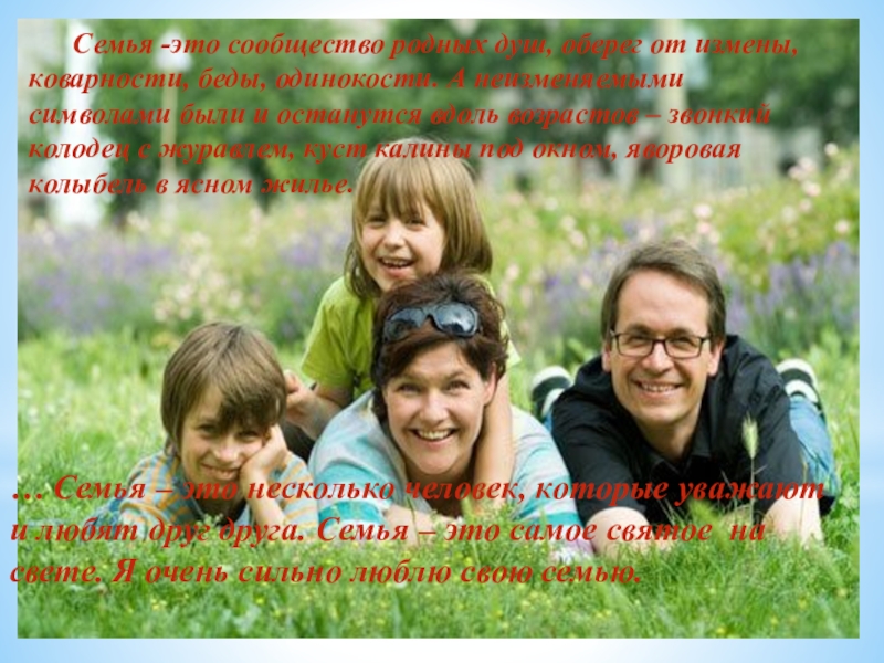 … Семья – это несколько человек, которые уважают и любят друг друга. Семья – это самое святое на свете. Я очень сильно люблю свою семью.