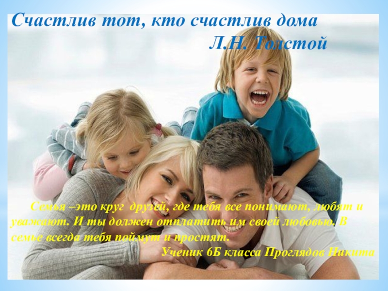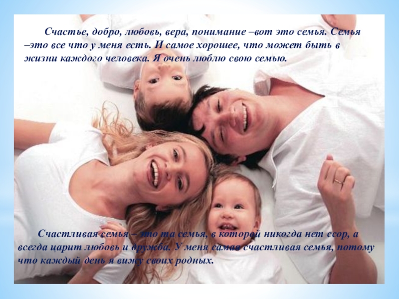 Счастливая семья – это та семья, в которой никогда нет ссор, а всегда царит любовь и дружба. У меня самая счастливая семья, потому что каждый день я вижу своих родных.