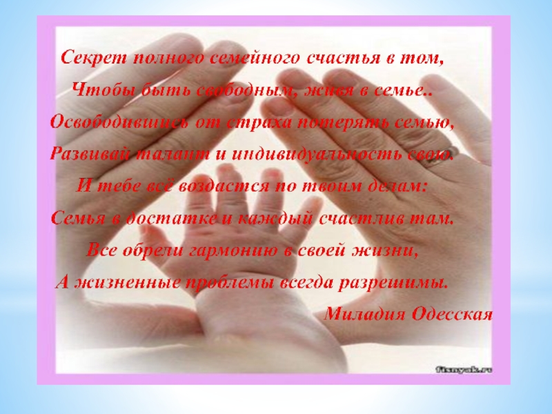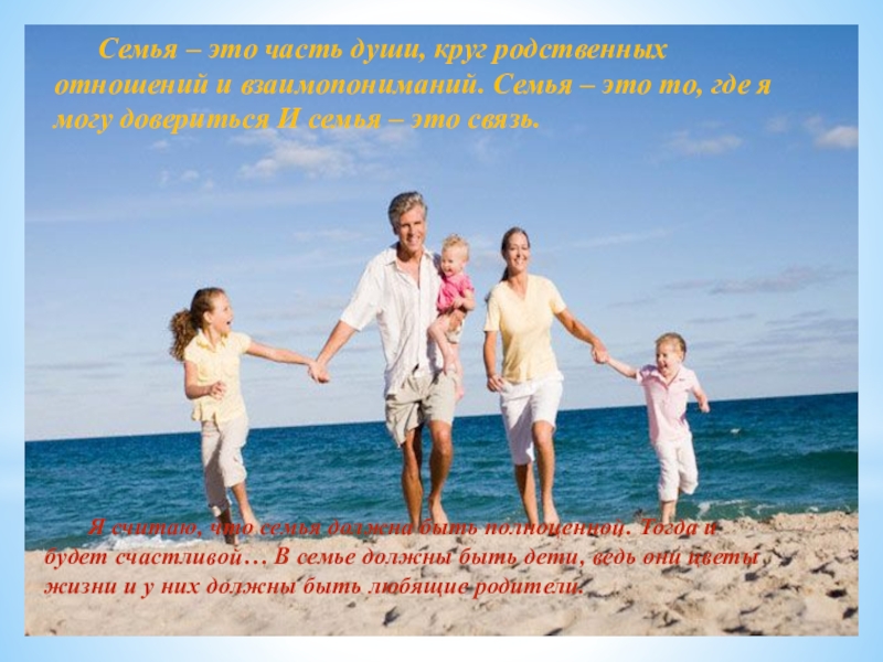 Я считаю, что семья должна быть полноценной. Тогда и будет счастливой… В семье должны быть дети, ведь они цветы жизни и у них должны быть любящие родители.