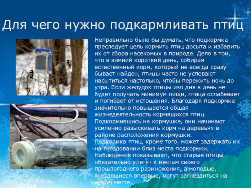 цель кормить птиц досыта и избавить их от сбора насекомых в природе. Дело в том, что в зимний короткий день, собирая естественный корм, который не всегда сразу бывает найден, птицы часто не успевают насытиться настолько, чтобы пережить ночь до утра. Если желудок птицы изо дня в день не будет получать минимум пищи, птица ослабевает и погибает от истощения. Благодаря подкормке значительно повышается общая жизнедеятельность кормящихся птиц. Подкормившись на кормушке, они начинают усиленно разыскивать корм на деревьях в районе расположения кормушки.