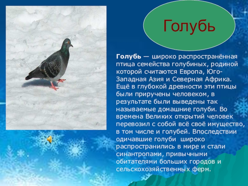 Голубь — широко распространённая птица семейства голубиных, родиной которой считаются Европа, Юго-Западная