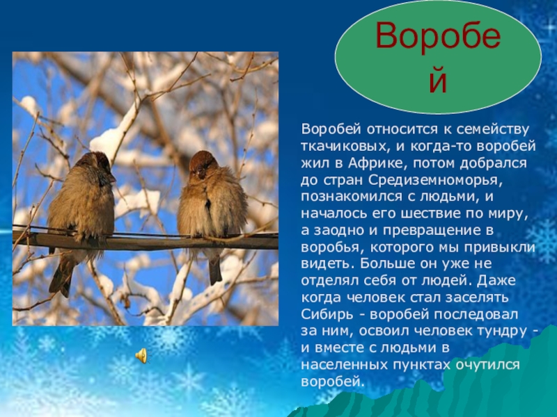 Слайд 20Воробей относится к семейству ткачиковых, и когда-то воробей жил в Африке,