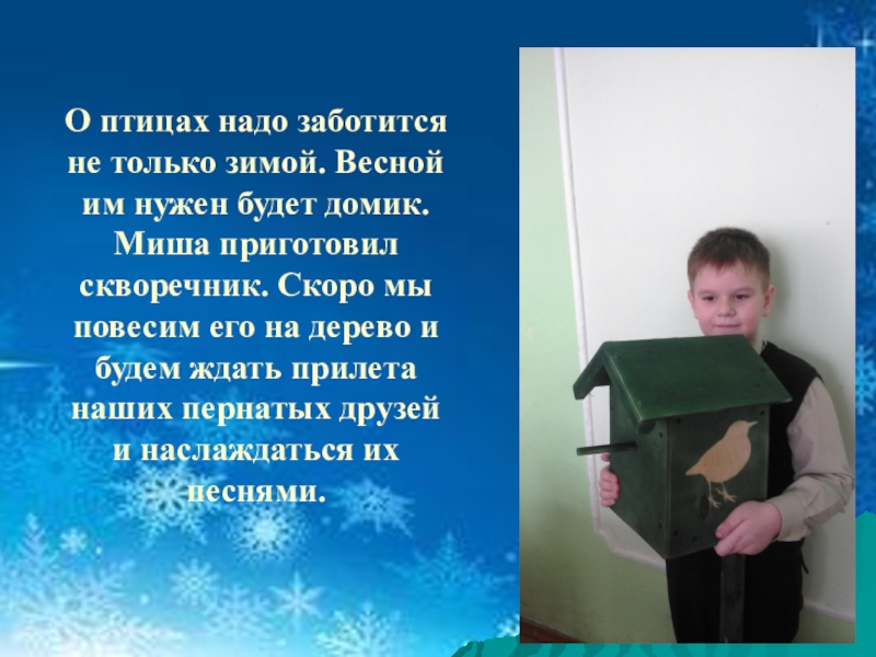 Слайд 15О птицах надо заботится не только зимой. Весной им нужен будет