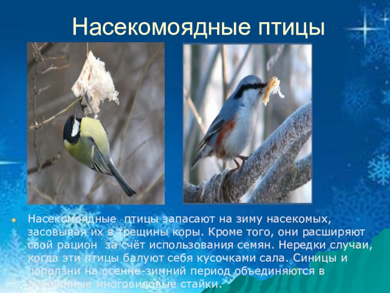 коры. Кроме того, они расширяют свой рацион за счёт использования семян. Нередки случаи, когда эти птицы балуют себя кусочками сала. Синицы и поползни на осенне-зимний период объединяются в смешанные многовидовые стайки.