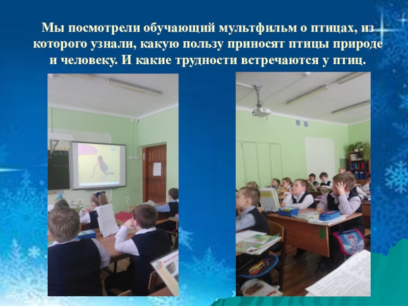 Слайд 6Мы посмотрели обучающий мультфильм о птицах, из которого узнали, какую пользу