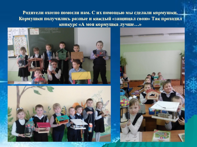 Слайд 9Родители охотно помогли нам. С их помощью мы сделали кормушки. Кормушки