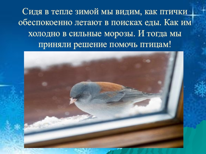 Слайд 3Сидя в тепле зимой мы видим, как птички обеспокоенно летают в