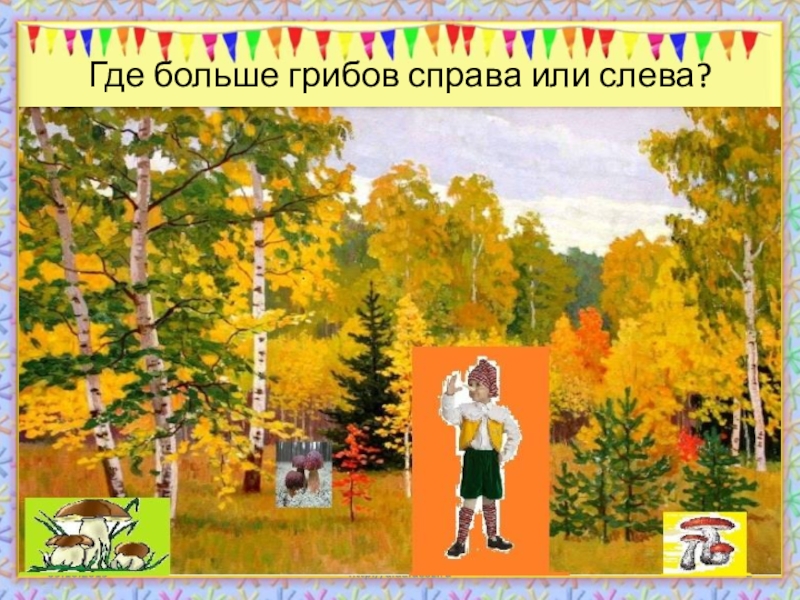Слайд 2Где больше грибов справа или слева?