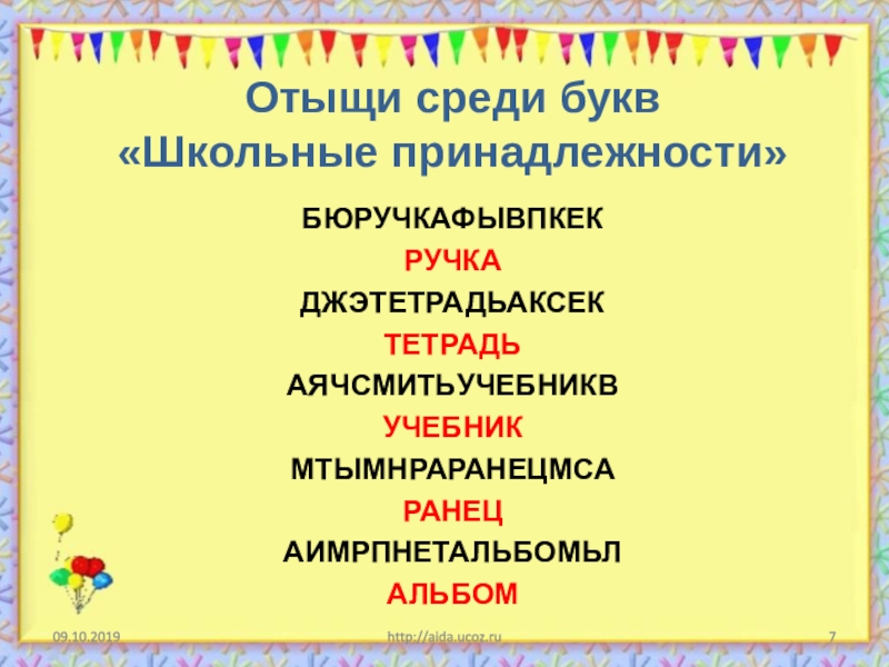 Отыщи среди букв  «Школьные принадлежности» БЮРУЧКАФЫВПКЕК РУЧКАДЖЭТЕТРАДЬАКСЕКТЕТРАДЬАЯЧСМИТЬУЧЕБНИКВУЧЕБНИКМТЫМНРАРАНЕЦМСАРАНЕЦАИМРПНЕТАЛЬБОМЬЛАЛЬБОМhttp://aida.ucoz.ru