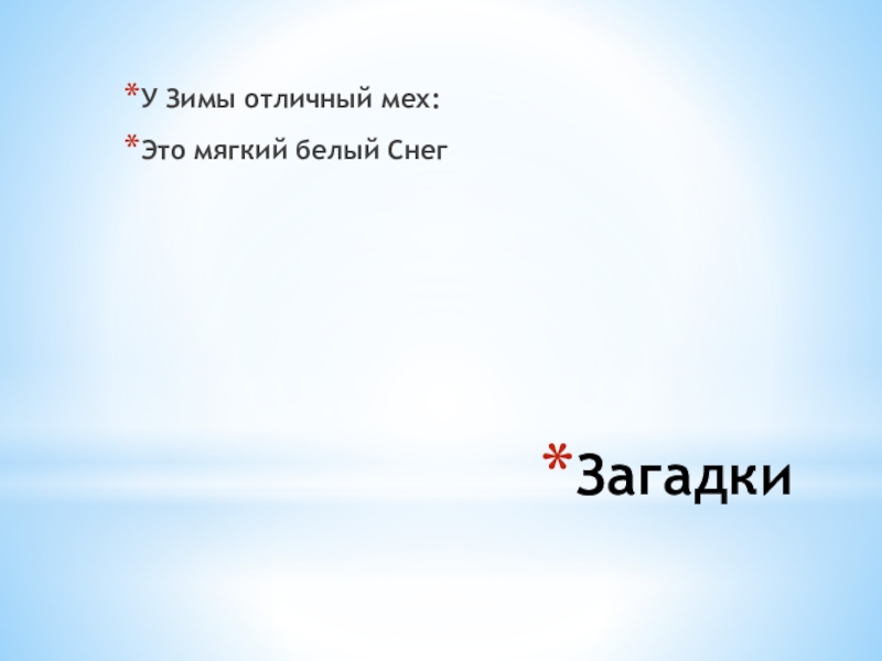 ЗагадкиУ Зимы отличный мех:Это мягкий белый Снег