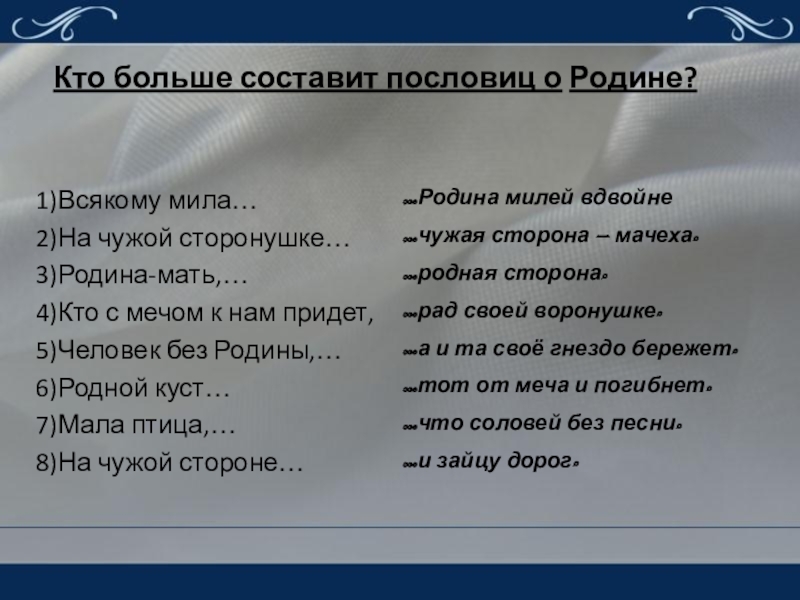 Кто больше составит пословиц о Родине?