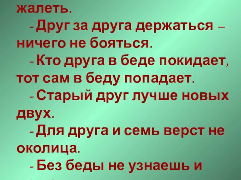 - Друга иметь – себя не жалеть.- Друг за друга держаться – ничего не бояться.- Кто друга
