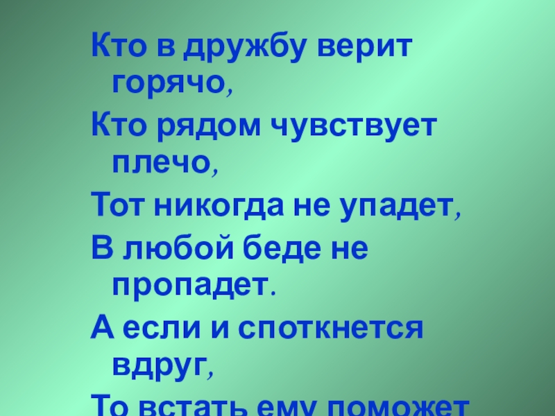 Кто в дружбу верит горячо,Кто рядом чувствует плечо,Тот никогда не упадет,В любой беде не пропадет.А если и споткнется вдруг,То встать ему поможет друг! Всегда в беде поможет другЕму протянет руку.