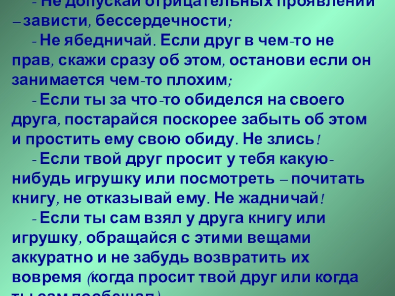- Не допускай отрицательных проявлений – зависти, бессердечности;- Не ябедничай. Если друг в чем-то не прав, скажи