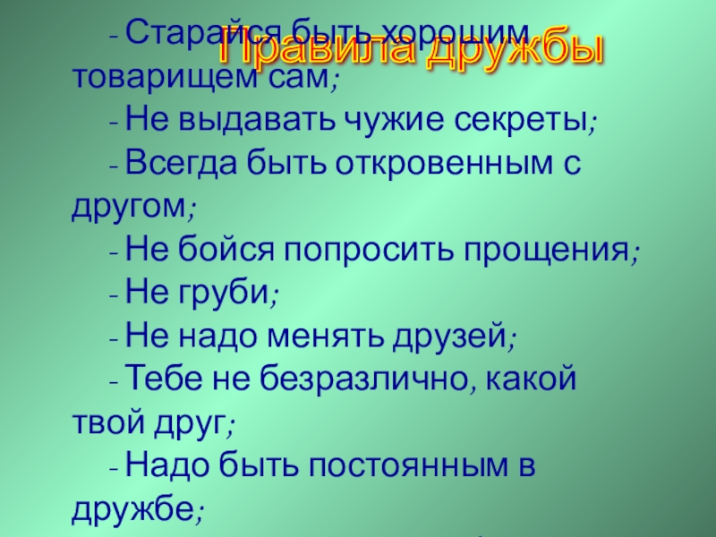 Правила дружбы - Старайся быть хорошим товарищем сам;- Не выдавать чужие секреты;- Всегда быть откровенным с другом;-